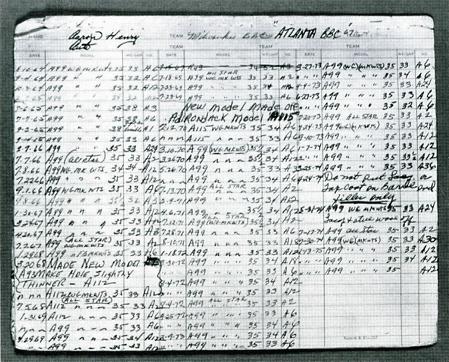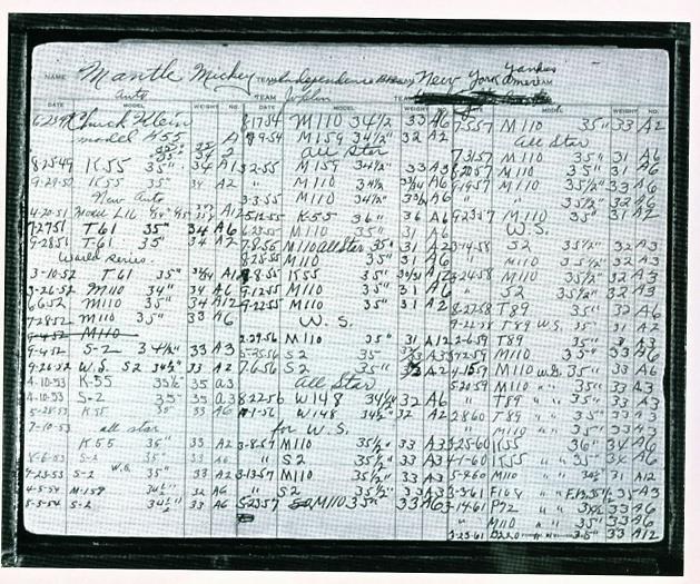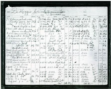 model ordered. Access to this information has proven to be extremely valuable to the hobby. This information has allowed collectors to distinguish between bats actually ordered and used by the player whose name appears on the barrel opposed to those bats that were ordered and sent to minor league team, town teams, and college teams. For instance, I owned a late 40s era Joe DiMaggio H&B. It was a model D29 with all of the appropriate labeling for a professional model H&B bat. However, it was 34” long. According to H&B records DiMaggio never ordered a 34” D29 during that era. So the question was…was it a DiMaggio gamer or something else? Well, there are a couple of possibilities. One possibility is that it was a professional model bat ordered and used by a minor league club. The other possibility is that, based on DiMaggio’s popularity, H&B made his model bats available to the public at some point. The third, and most appealing to the owner of the bat, was that it was a bat ordered and used by DiMaggio that was either recorded incorrectly in H&B records or not recorded at all. Never the less, since its existence was not supported by the H&B shipping records, the value and interest was significantly impacted. To give you some indication, a DiMaggio gamer in nice condition and supported by H&B records would fetch $10-$15,000. Whereas, the bat that I owned was sold to another collector, knowing full well about the fact that its existence was supported by the H&B shipping records, for $2,000. A copy of the H&B shipping records showing the bats DiMaggio ordered from 1941-1944 is shown below. Since the process for